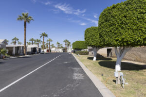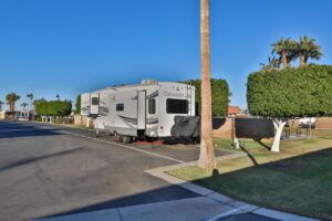 RV #5 space measures 50′ long ×12 ‘ wide, allowing for the parallel parking of the RV. There is an additional parking space along the adjacent wall for a vehicle. The space is located near the Clubhouse and swimming pool.