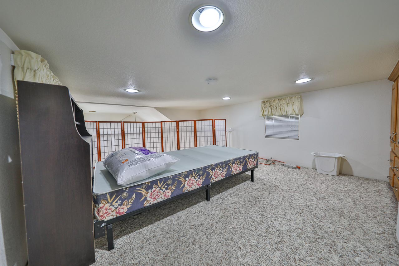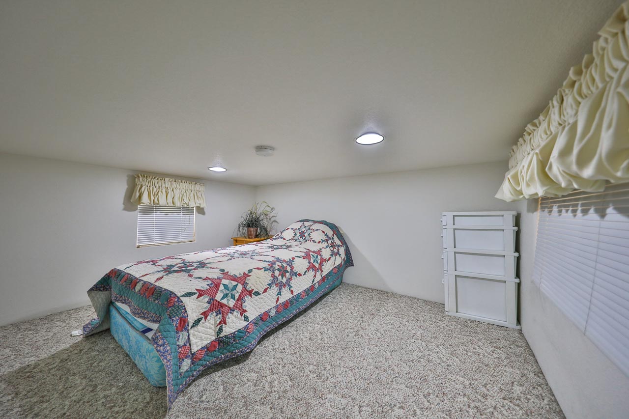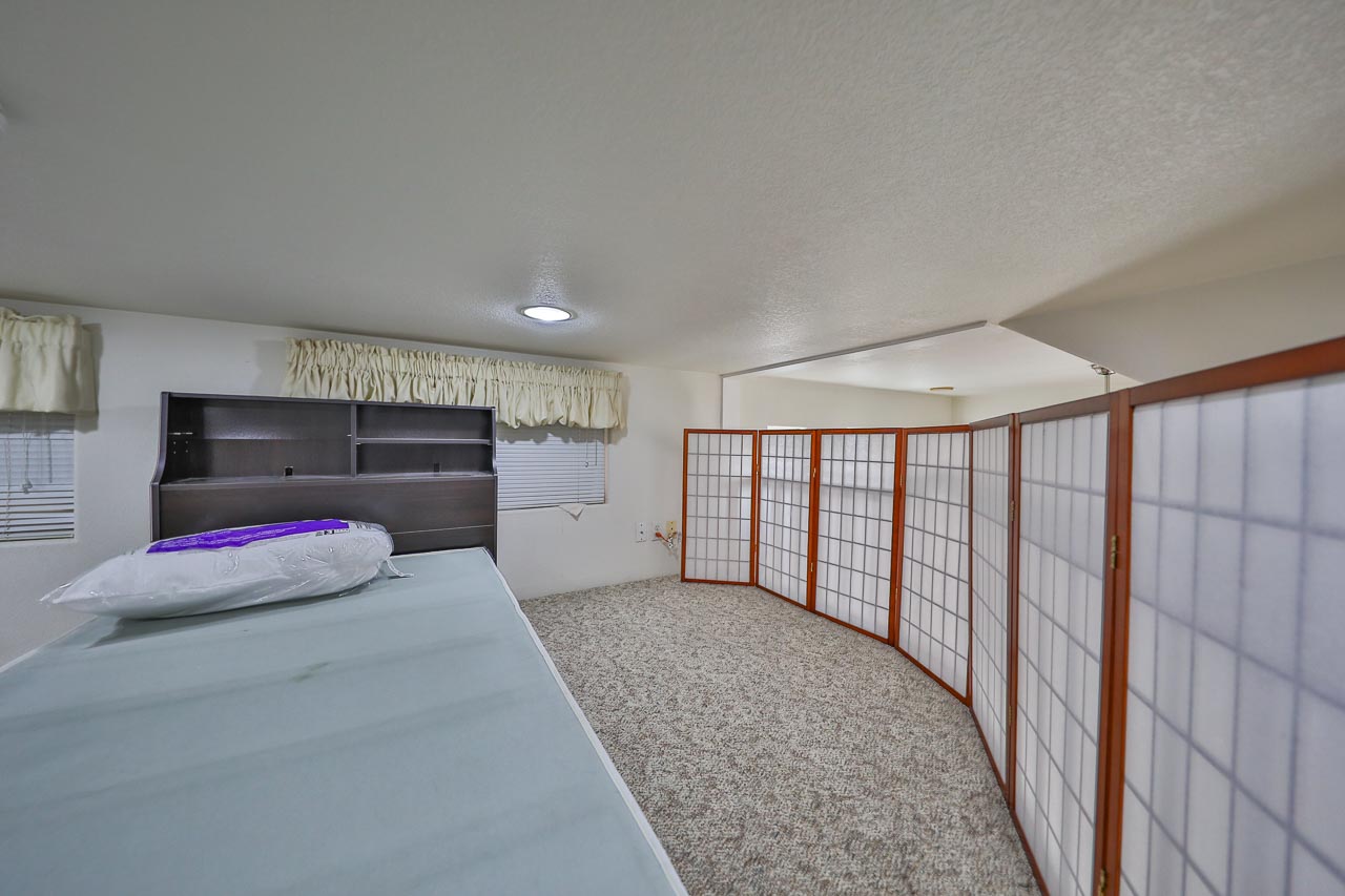 Narrow staircase to an upper level with twin beds, ideal for grandkids to visit.