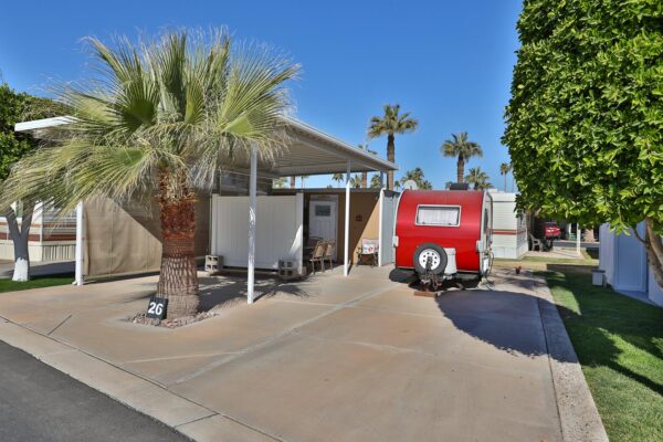 Large awning over the living space. Lovely casita building with 1/2 bath, washer and dryer, work bench and large storgage closet.